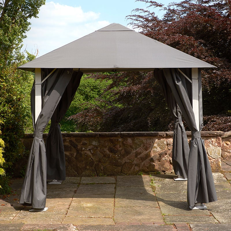 A wonderfully stylish location for your garden furniture, offering shade from the sun and shelter from showers, the 8×8 Glendale Vintage Grey Garden Gazebo (2.5×2.5m) is robust, durable and sports a fashionable shabby-chic design.Supported by a white, powder-coated, 3-inch steel frame, with heavy-duty fixing plates, this contemporary garden gazebo is built to last and impervious to rust. The vintage-style, heavy-duty, PVC canopy provides effective shade from the sun and shelter from showers, so this garden gazebo can be at the centre of your outdoor entertainment plans, come rain or shine.If you require additional shade or privacy, simply draw the beautiful complementary curtains to the desired position. When theyâ??re not in use, you can neatly attach them to the posts using the matching tabs and ties. Whatever you decide, an invaluable air vent, positioned at the top of the pyramid-shaped roof, ensures you can relax in a comfortable environment.This vintage gazebo comes with a reassuring 1-year guarantee and clear instructions to help you achieve a straightforward assembly.You can purchase this particular style of garden gazebo in 3 sizes â?? all with the same superb specifications.Free delivery is available to most UK addresses.White, powder-coated, 3-inch steel frameHeavy-duty fixing platesVintage-style, heavy-duty, PVC canopyComplementary curtains with ties and tabs come as standardPyramid-shaped roof includes air ventReassuring 1-year guaranteeClear instructions for a straightforward assembly3 different sizes availableFree delivery to most UK addresses
